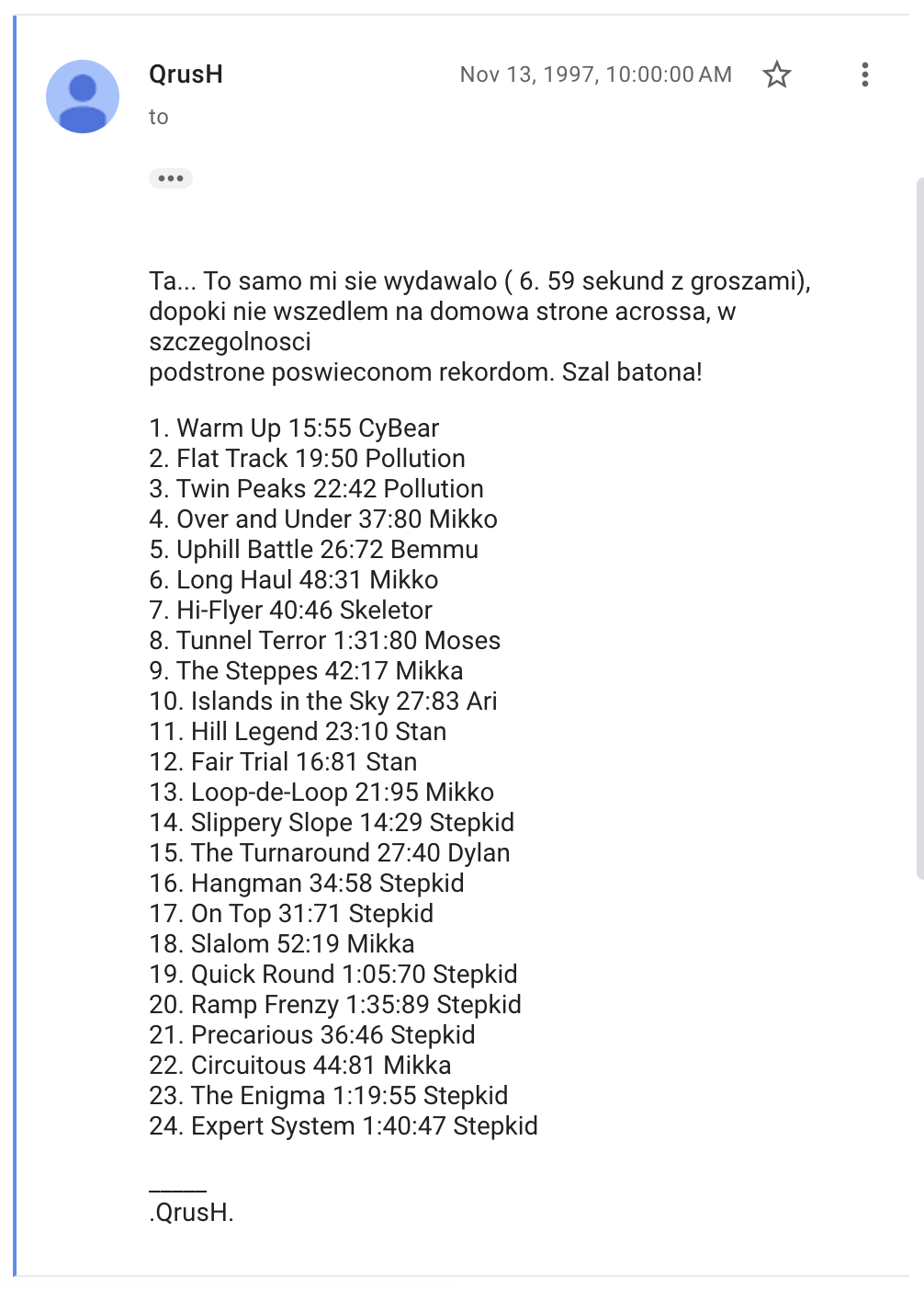 • 2026-02-14 Add the first mention of the WR table (by Jerzy) (1997-10-24). Add the first (known) WR table data (by J. Sitowski) (c. 1997-11-02). Add the second (known) WR table data (by QrusH) (c. 1997-11-13). Add the fact Mikko having 54 % of all WRs in one table (Early December 1997). Add the first (known) interview of Balázs (by J. Sitowski) (1998-05-01).