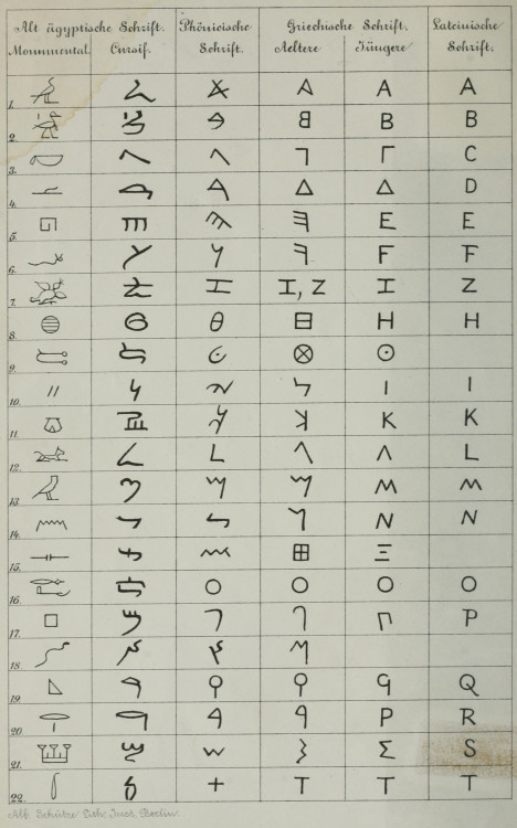 Kirjaimien kehitys hieroglyfeistä latinalaiseksi aakkostoksi (3100–700 BC). Sarakkeet vasemmalta alkaen: egyptiläinen hieroglyfi, hieroglyfi kursivoituna, foinikialainen kirjain, vanha kreikkalainen kirjain, nyky-kreikkalainen kirjain sekä latinalainen versio samasta kirjoitusmerkistä. © Public Domain