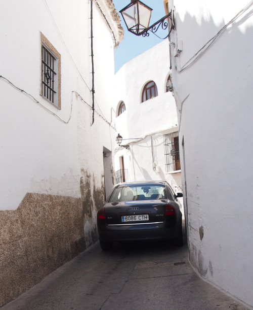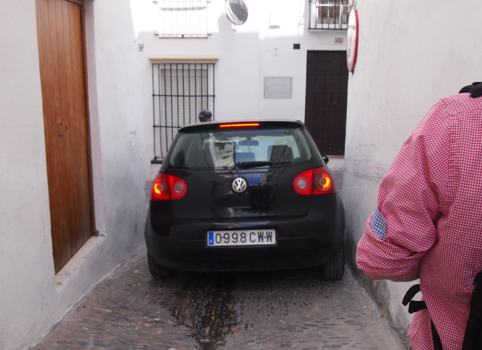 Saan juuri ja juuri survottua auton toivottuun aivan liian pieneen ruutuun. Sitten nostamme tavarat sisÀÀn, jonka jÀlkeen hotellivirkailija ilmoittaa, ettÀ nyt voimme viedÀ auton lÀheiseen parkkihalliin. KyllÀ. Juuri. Siihen. Samaan. Halliin. Espanja. Arvasin tÀmÀn ja juuri sen takia kysyin asiasta etukÀteen, jotta sekÀ hotelli ettÀ me pÀÀsisimme helpommalla ja bonuksena saisimme 15 minuuttia pidemmÀn illallisen. Ilmeisesti pyyntö oli kuitenkin heille toisesta ulottuvuudesta. KyllÀhÀn parkkihalliin matkaa oli ainakin 200 metriÀ. Nopeasti ajateltuna sitÀ kuvittelisi, ettÀ hotelleissa osattaisiin tÀyttÀÀ asiakkaiden toiveita, mutta toisaalta alan epÀillÀ, ettÀ espanjalaiset oppivat jo Àidinmaidosta: sivuparkin. Ahdas Al-Andalus.