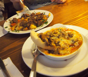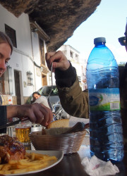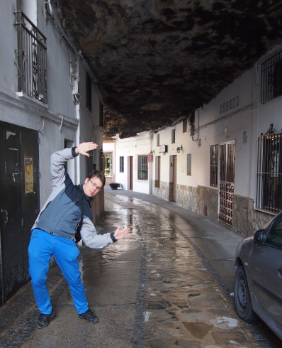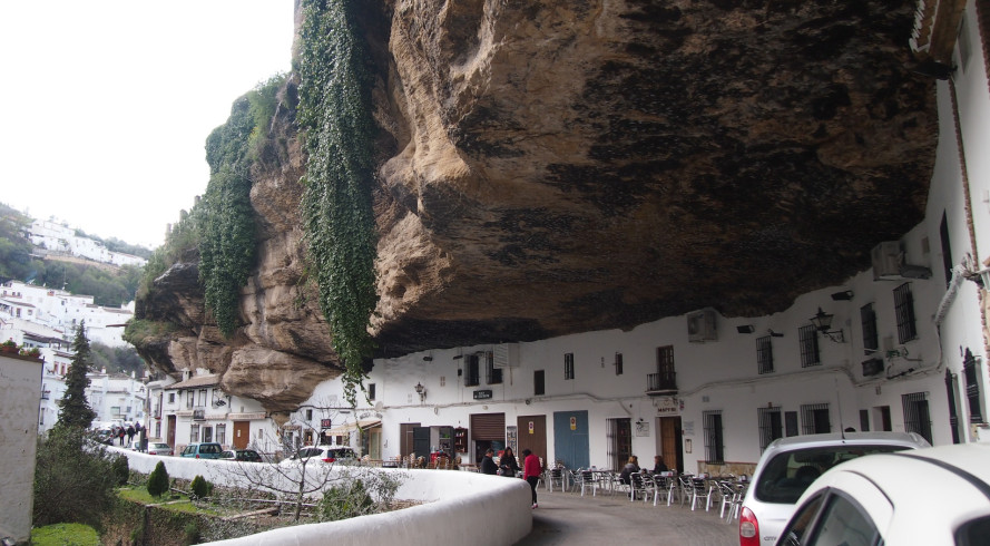 PysÀhdymme Setenil de las Bodegasissa, missÀ ihmiset asuvat kiven alta. Lounaaksi haudutettu potka.