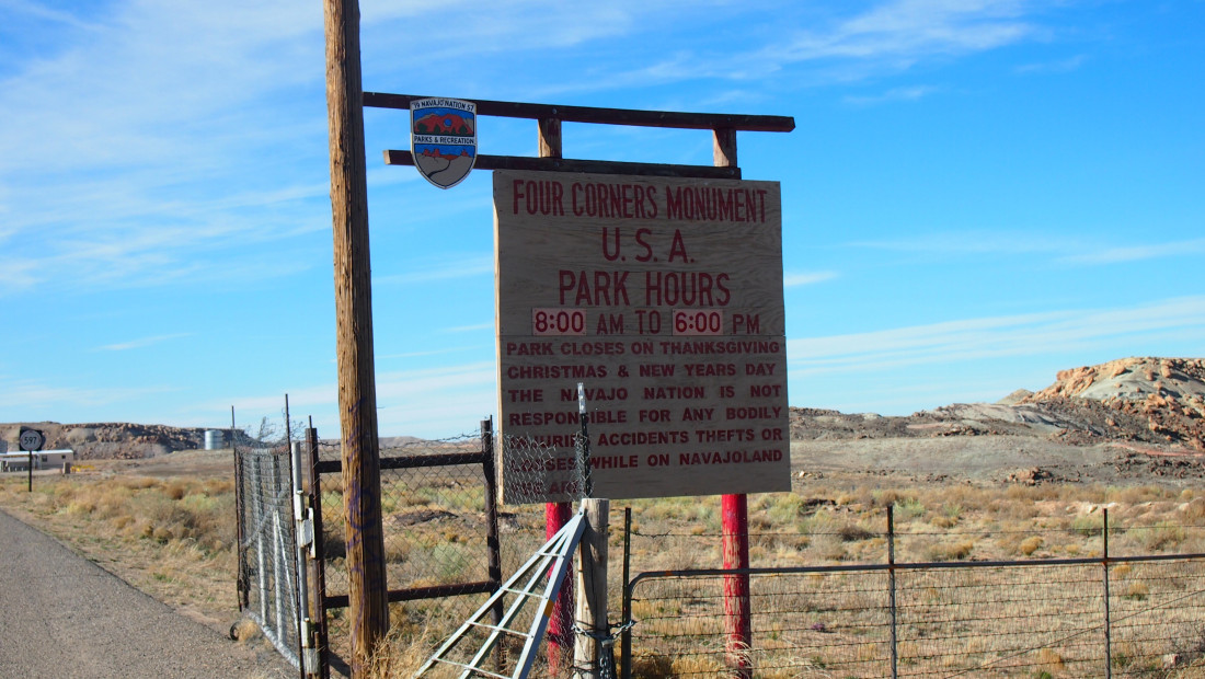 Mesa Verden jälkeen koukkaamme New Mexicon puolelle hakemaan osavaltiopisteet. Coloradon, New Mexicon, Arizonan ja Utahin rajapyykillä olevaa kiveä pääsee katsomaan kymmenellä dollarilla. Suomessa kolmen valtakunnan rajapyykki on ilmainen, joten pitäkööt kivensä.