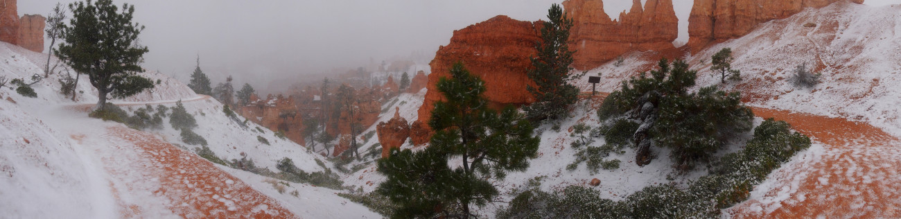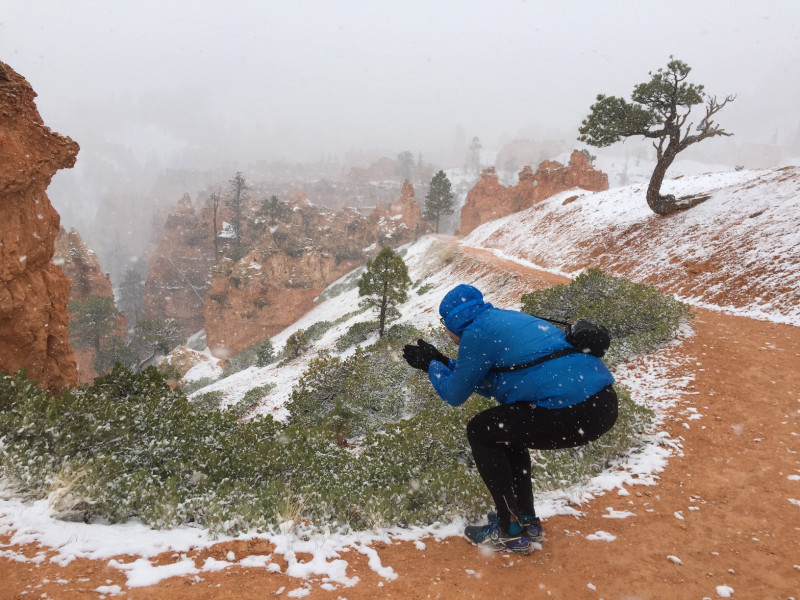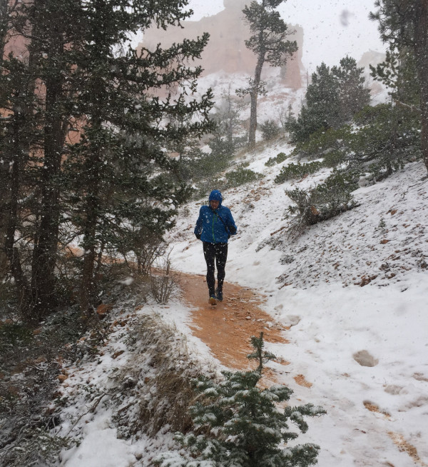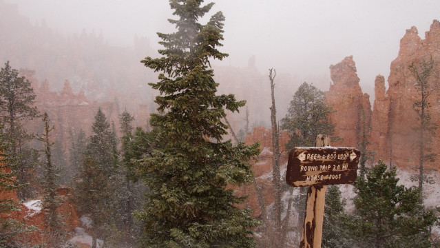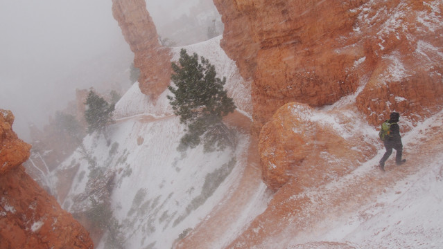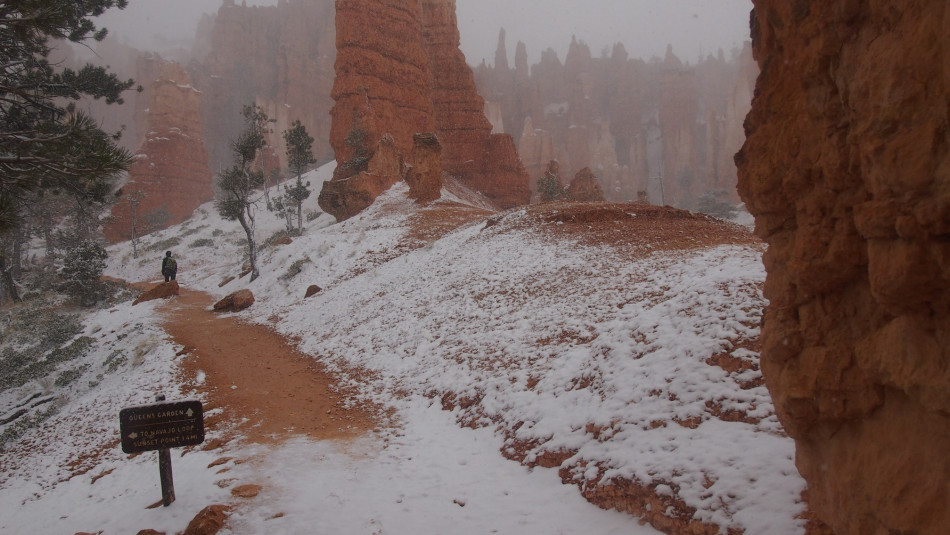 Kierrämme Palkintokanjonin puistossa reitit Peek-A-Boo Loop, Navajo Loop ja Queen's Garden. Iltapäivällä sataa lunta, joten poluilla ovat ainoastaan suomalaiset.