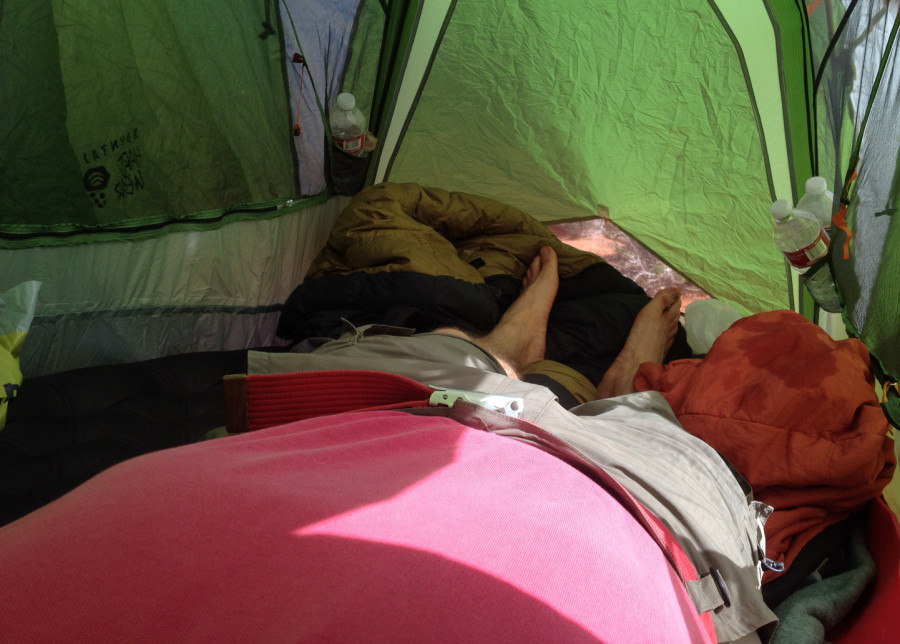 Kännykän huutaessa ylös kello 5:30, on ulkona pimeys ja sisällä kylmyys. Hermun ideasta jätämme teltan ovet yöksi auki, jottei kosteus häiritse unia. Ostoslistalle: untuvatakki. Lopulta on kuitenkin hienoa seisoa lähtöviivalla auringon noustessa laakson ylle.
