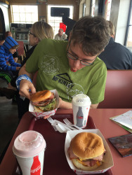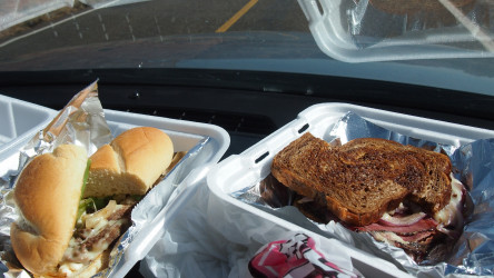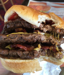 Testasimme reissun aikana useita hampurilaisketjuja ja voittajaksi julistan Wendy'sin, jonka triplapurilainen neliöpihveillä on yksinkertaisesti lyömätön (viite). Hampurilaisessa on lihaa 330 grammaa, mikä $6,59 hinnalla tarkoittaa, että kilohinta on 18,18 €/kg. Suomessa McDonald'sin juustohampurilaisessa liha maksaa 22,22 €/kg.