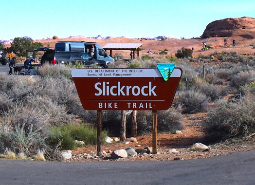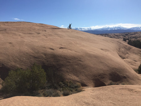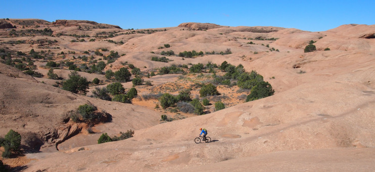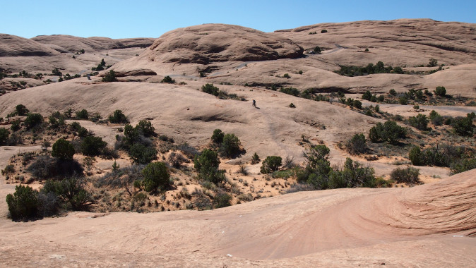 Moabissa maastopyöräilemme Slickrock Traililla (viite). Maasto on sopivan kumpuileva ja renkaalla on hiekkapaperimaisen karhealla pinnalla erinomaisen hyvä pito.