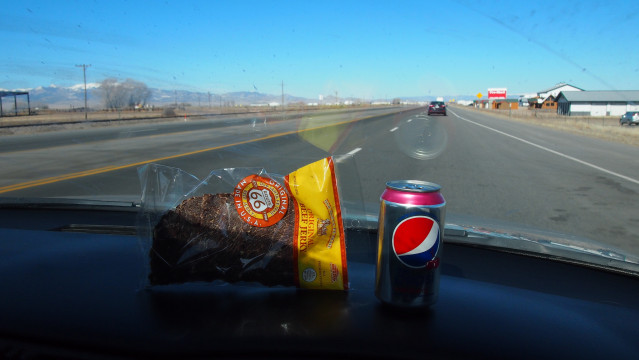 Ensimmäisenä päivänä ajamme 900 kilometriä. Tarviketäydennyksellä käymme Alamosan Walmartissa, jonka valikoimat peittoavat Ruoholahden Sittarin. Ostamme kuivalihaa, pekonirouhetta, limesipsejä, kirsikkalimua, mansikkamelatoniiniä sekä paljon munkkeja.
