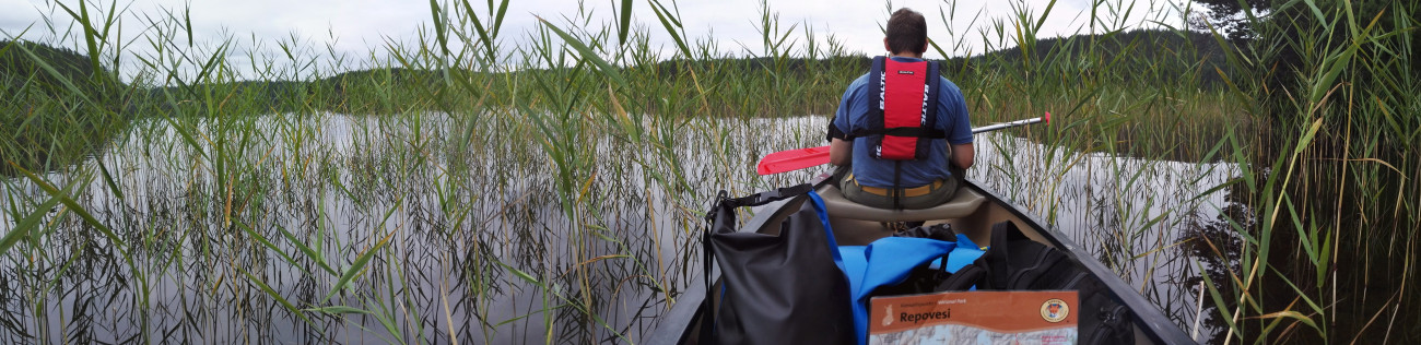 Repoveden kansallispuiston melontareittejä on kehuttu, joten sinne käy meidänkin mela (viite).