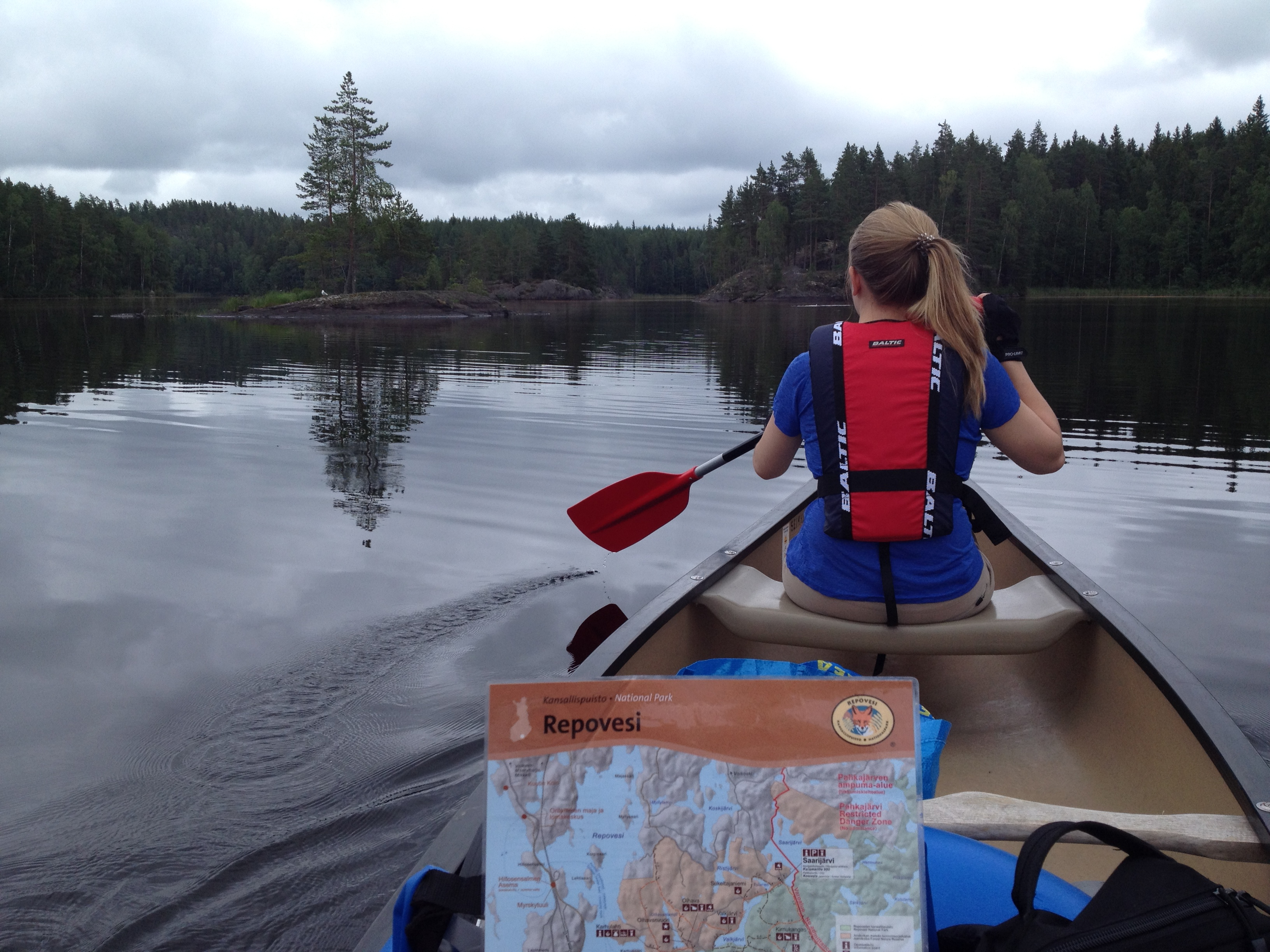 Automatka Helsingistä Repovedelle kestää kolme tuntia. Retkimuonat ostamme Kuusankoskelta ja kaksikkokanootin vuokraamme Seikkailuviikarilta, jota voi suositella (viite). 80 eurolla saamme kanootin ja varusteet kahdeksi vuorokaudeksi (liivit, kartan, melat ja tynnyrin kuivatavaroille). Auton voi jättää vuokraamon pihalle.