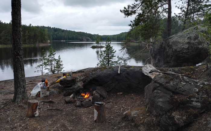 Lauantaina melomme viisi tuntia ja tässä ajassa kerkeämme kiertää Tervajärven ja Valkjärven. Leirin laitamme pystyyn Kuutinlahden rannalle. Illalliseksi italianpata.