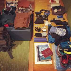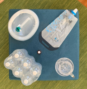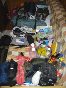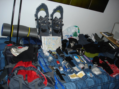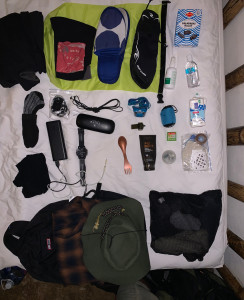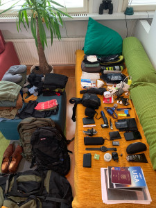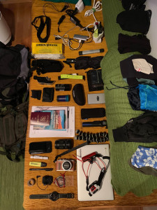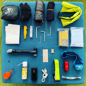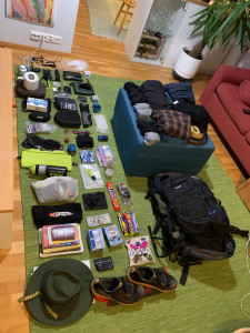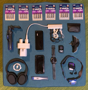 * reppu (+ kuivakassi) (+ airtag-paikannin) * kuulokkeet * otsalamppu (+ lisävirta) (+ varalamppu) * varavirtapankki (+ laturi) * dosetti (+ reseptit, lääkkeet) * kirja (+ kirjanmerkki) * selvitysharja * vesipullo * pähkinät * läppäri (+ kaapeli) * sykemittari (+ kaapeli) * treenivihko (+ kynä, pyyhekumi)